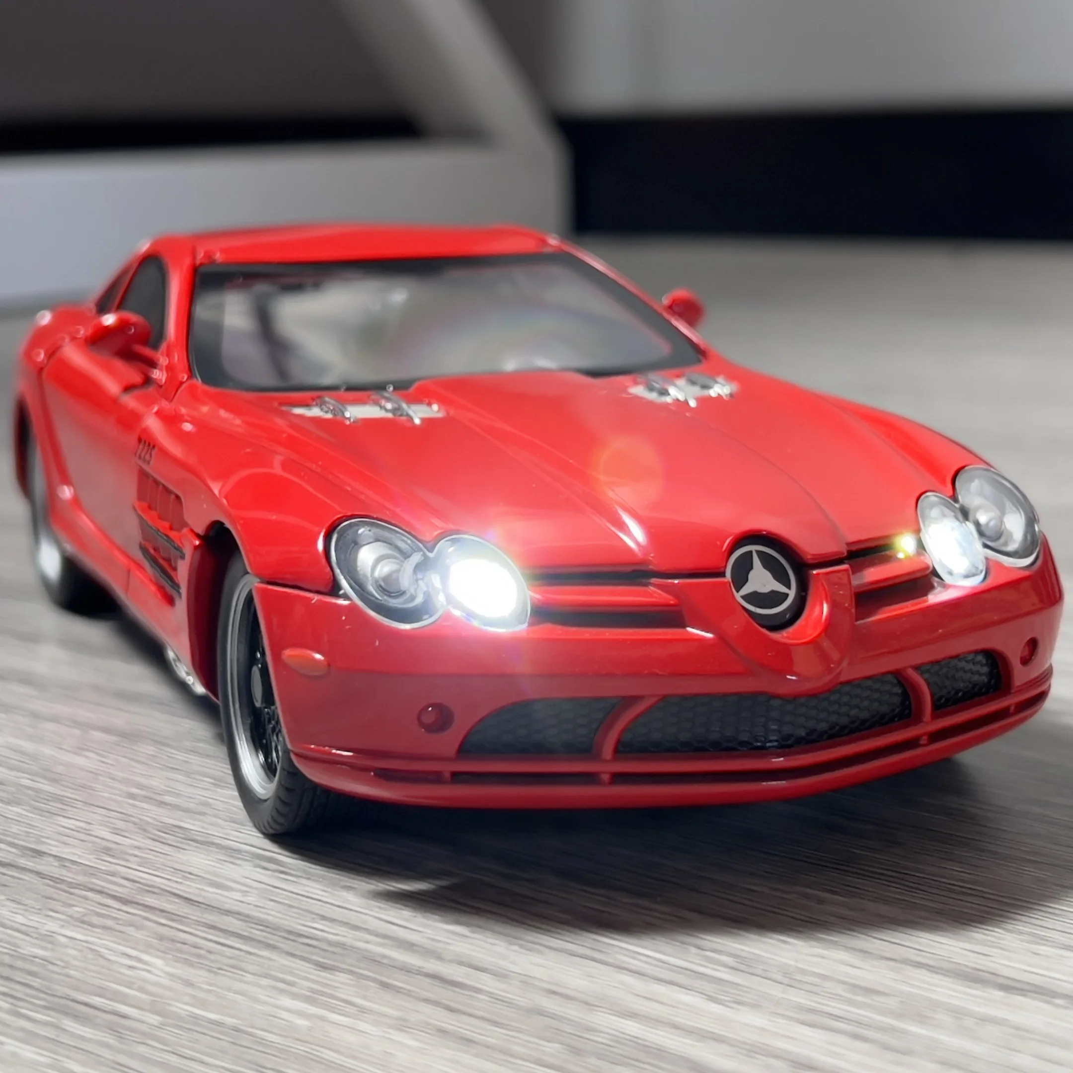 - High-Detail Design: Every inch of this collectible car model is crafted with meticulous attention, replicating the original Benz SLR McLaren 722 S Roadster’s sleek angles and luxury finishes.