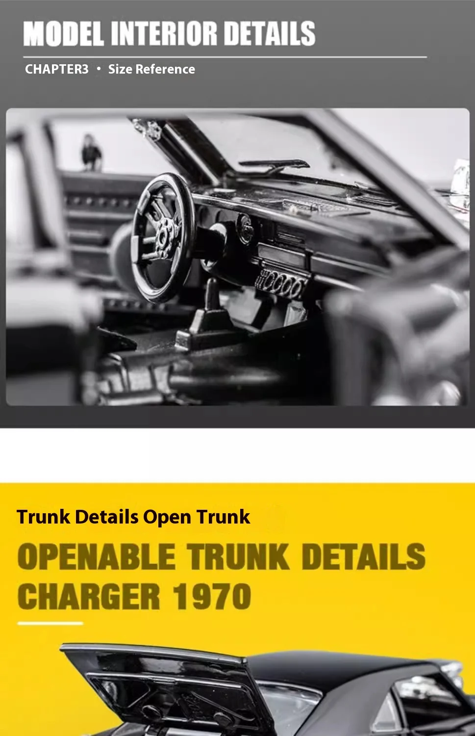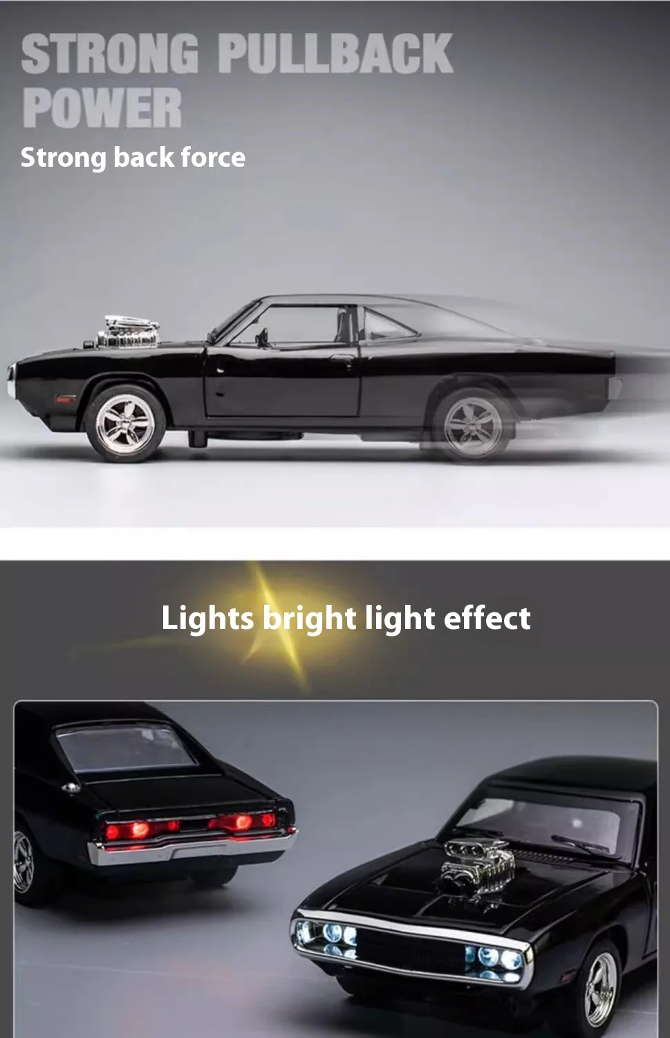 • Authentic Design: Faithful reproduction of the 1970 Dodge Charger’s classic lines and distinctive features.