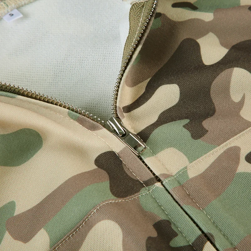 This camouflage tracksuit serves as a testament to the modern trend of women’s athleisure wear. It’s not only crafted for function but also provides a chic solution to modern casual dressing. The subtle yet striking design elements complement the uniformity of the camouflage pattern, granting you the confidence to express your unique style effortlessly.
