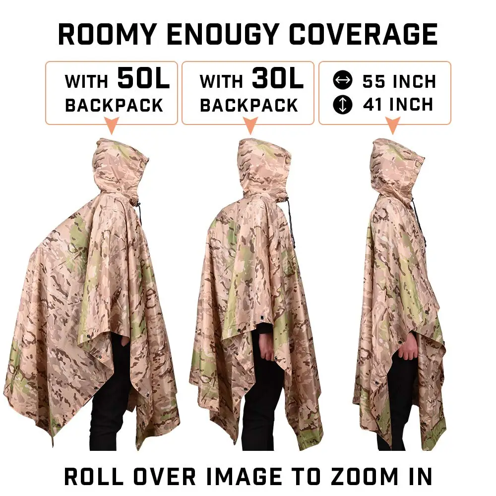 • Multi-Functional Design: Not just any outdoor gear, this military-style poncho is designed to serve multiple purposes — from a raincoat to a makeshift shelter, making it indispensable for survival activities and tactical operations.